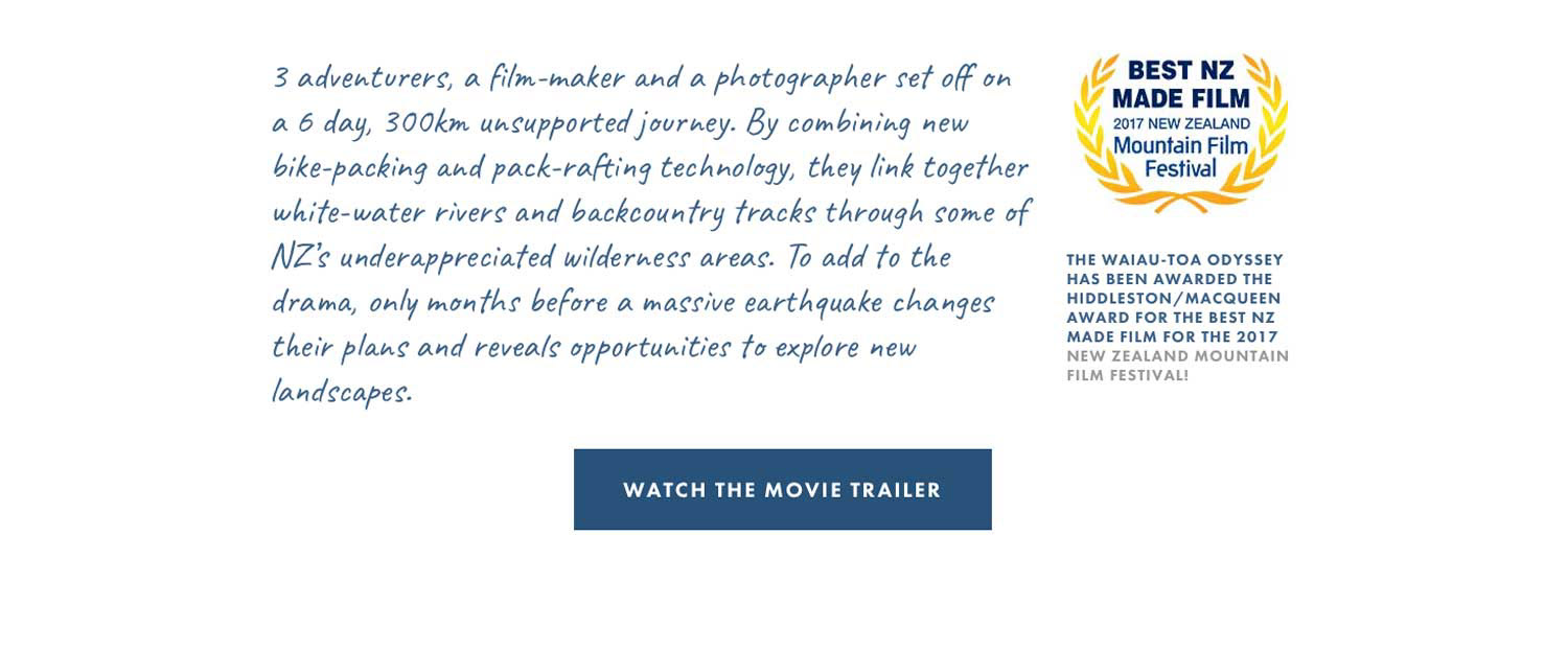 Project roles: Film project management, Website design, film project management, social media Strategy, media management. About the film: 3 adventurers, a film-maker and a photographer set off on a 6 day, 300km unsupported journey. By combining new bike-packing and pack-rafting technology, they link together white-water rivers and backcountry tracks through some of NZ’s underappreciated wilderness areas. To add to the drama, only months before a massive earthquake changes their plans and reveals opportunities to explore new landscapes. The Waiau-toa Odyssey has been awarded the hiddleston / macqueen Award for the best NZ made film for the 2017 New Zealand mountain film festival!